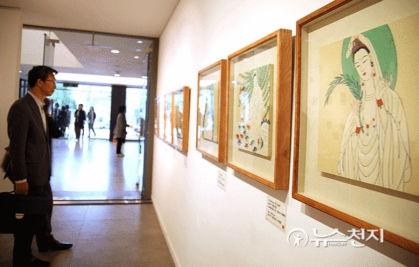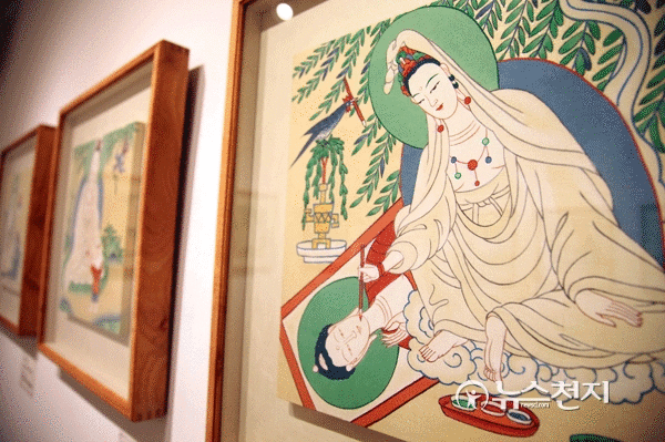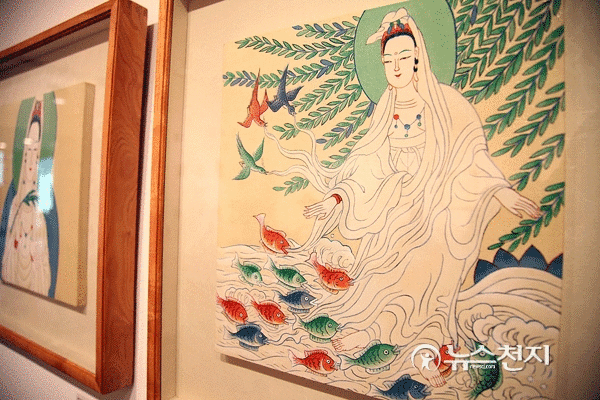 이번 전시회는 관세음보살에는 중생의 기도에 응답하는 32가지 모습을 고려불화기법과 현대회화의 미니멀리즘 결합으로 담아낸 작품이 40여점 전시됐다.