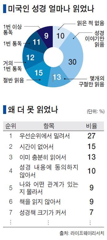 성경을 더 자주 읽지 않는 이유로는 ‘다른 우선순위에 밀려서(27%)’ ‘시간이 없어서(15%)’ ‘이미 충분히 읽어서(13%)’ ‘성경 내용에 동의하지 않아서(10%)’ ‘나와 어떤 관계가 있는지 몰라서(9%)’ ‘책을 읽지 않기 때문(9%)’ 등의 순으로 나타났다.