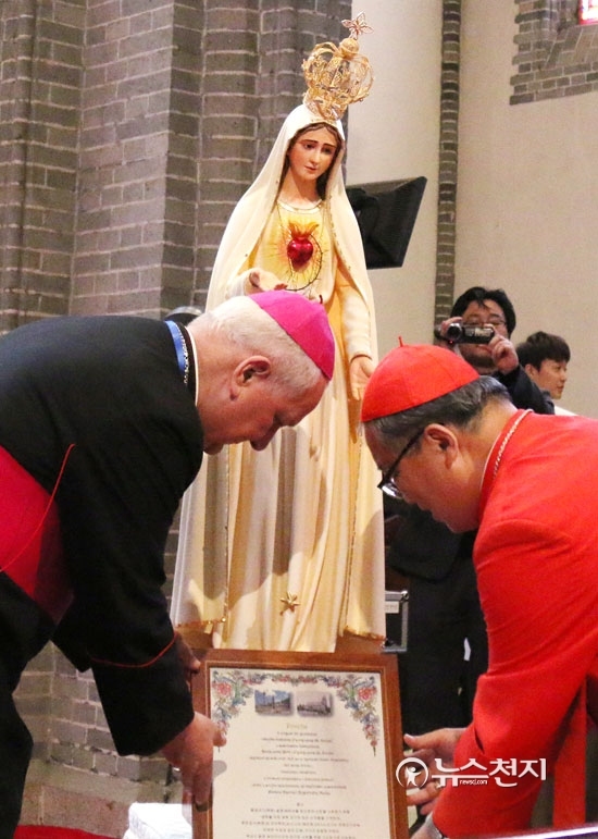한국 가톨릭교회는 세계 유일의 분단국가인 우리나라에 ‘파티마의 성모’가 더욱 각별한 의미를 주고 있다고 보고 있다. 특히 천주교 서울대교구(교구장 염수정 추기경)는 올해 ‘파티마의 성모 발현’ 100주년을 맞아 5월부터 10월까지 교구 전 구성원과 함께 한반도와 세계의 평화를 위해 매일 묵주기도를 봉헌한다. 교구장 염수정 추기경은 평양교구장 서리를 맡고 있다. 염 추기경은 지난 2일 교구 사제 및 수도자, 평신도를 대상으로 특별사목서한을 발표하고 “정치적, 외교적으로 매우 어렵고도 중요한 시기를 보내고 있는 이 시기에 특별히 한반도의 평화와 북녘의 교회를 위해 기도한다”며 신자들에게 고해성사 및 ‘한반도와 세계 평화’를 위한 지향으로 묵주기도를 권고했다.