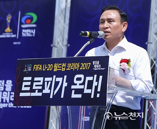 [천지일보 천안=박주환 기자] 충남 천안시(시장 구본영)가 FIFA U-20 월드컵 성공개최를 위해 5일 오후 종합운동장 내 분수대 광장에서 ‘트로피가 온다’ 행사를 개최했다.