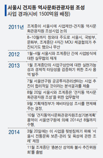 10.27법난기념관사업과 별도로 서울시도 광화문-경복궁-인사동 일대의 관광자원화를 고민하던 중 2011년 조계종이 서울시에 제안한 견지동 역사문화관광자원 조성사업을 받아들여 2014년 3월 ‘서울시 전통문화 보존·관리 및 육성에 관한 조례’를 제정했다. 이를 근거로 해당 사업에 시비 1500억원을 배정했다. 이로 인해 국비로 진행되는 10.27법난기념관을 포함해 조계종 인근 관광단지화에 지원되는 혈세만 3000억원에 이른다.