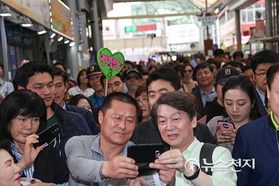 [천지일보 천안=박주환 기자] 제19대 대통령선거 안철수 국민의당 후보가 8일 오후 충남 천안시 동남구 중앙시장에서 ‘뚜벅이 유세’를 이어갔다. 천안시민들이 안 후보와 사진을 찍으려고 뒤따르고 있다.
