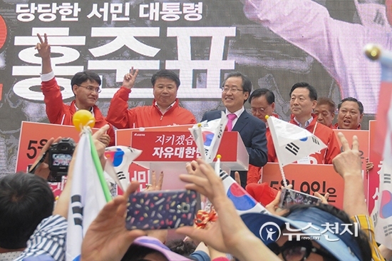 [천지일보 천안=박주환 기자] 제19대 대통령선거 홍준표 자유한국당 후보가 선거유세 마지막 날인 8일 오후 충남 천안시 야우리광장 일원에서 ‘자유 대한민국 수호를 위한 충청대첩’ 유세를 펼치고 있다.