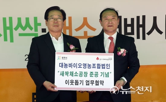 [천지일보=박혜옥 기자] 15일 오후 경기도 광주시 퇴촌면에서 열린 ‘대농바이오 새싹·채소 재배사 준공식’에서 황성헌 대농바이오 대표와 조억동 광주시장이 업무협약을 체결한 뒤 기념촬영을 진행하고 있다.