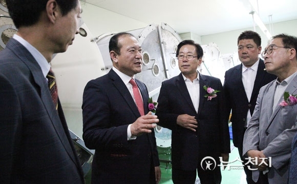 [천지일보=박혜옥 기자] 15일 오후 경기도 광주시 퇴촌면에서 열린 ‘대농바이오 새싹·채소 재배사 준공식’에서 황성헌 대농바이오 대표가 조억동 광주시장 등 내빈들과 함께 공장 현장을 시찰하고 있다.