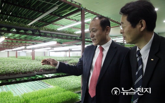 [천지일보=박혜옥 기자] 15일 오후 경기도 광주시 퇴촌면에서 열린 ‘대농바이오 새싹·채소 재배사 준공식’에서 황성헌 대농바이오 대표와 배선장 ISO국제심사원협회 사무총장이 공장 현장을 시찰하고 있다.
