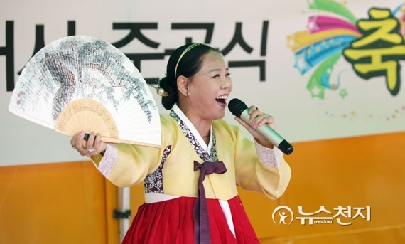 [천지일보=박혜옥 기자] 15일 오후 경기도 광주시 퇴촌면에서 열린 ‘대농바이오 새싹·채소 재배사 준공식’에서 명창 남궁정애 홍보대사가 판소리를 열창하고 있다.