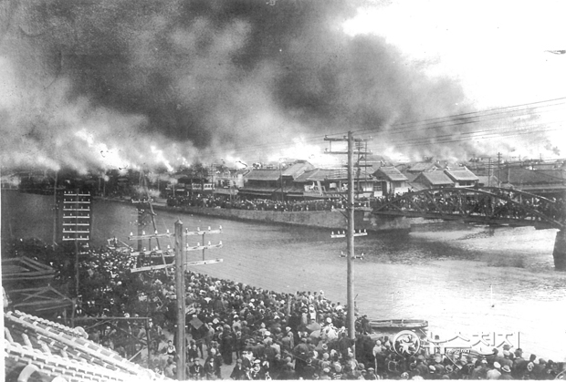 요코하마 강둑 주변에 많은 사람들이 모여 있고 그 뒤로 화염에 휩싸인 모습이다. 지진으로 인해 화재가 많이 발생했는데, 이 화재를 일본은 조선인들이 방화를 했다고 유언비어를 퍼트리면서 자경단을 자극해 살해하도록 했다.