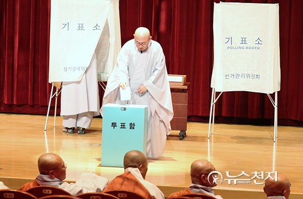 [천지일보=박준성 기자] 대한불교조계종 제35대 총무원장 선거가 12일 오후 1시부터 서울 중구 한국불교역사문화기념관 전통문화예술공연장에서 진행되고 있다. 조계종 중앙선거관리위원회는 3시 투표가 마무리 되며 이후 개표 결과를 발표할 예정이다. 이번 총무원장 선거는 기호 1번 설정스님과 기호 2번 수불스님의 2파전으로 치러진다.