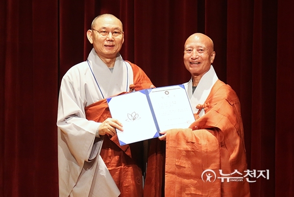 [천지일보=박준성 기자] 한국불교 최대 종파인 대한불교조계종 제35대 총무원장에 설정스님(75, 오른쪽)이 당선됐다. 12일 서울 종로구 한국불교역사문화기념관에서 실시된 제35대 총무원장 선거에서 설정스님은 선거인단 319명(유효 316표, 무효 3표) 가운데 과반을 훌쩍 넘긴 234표를 얻어, 경쟁자인 수불스님(82표)을 압도적인 표차로 누르고 총무원장으로 선출됐다.