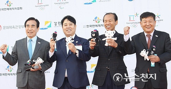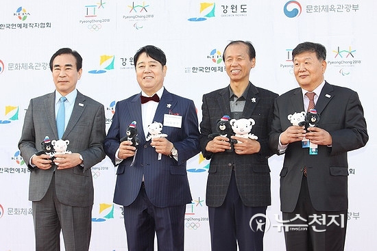 [천지일보=유용주 객원기자] 최문순 강원도지사(세 번째), 노태광 문화체육관광부 2차관(네 번째), 김영진 연예제작자협회 회장(두 번째)이 4일 오후 강원도 평창군 대관령면 평창올림픽플라자 특설무대에서 열린 2018 평창동계올림픽 G-100 특별이벤트 ‘2017 드림콘서트 in 평창’ 포토월에서 포즈를 취하고 있다.