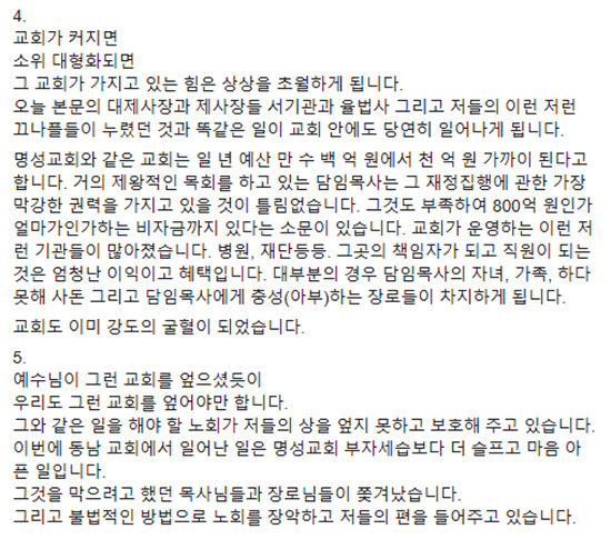 이어 “그것도 부족해 800억원인가 얼마 인가하는 비자금까지 있다는 소문이 있다”며 “교회가 운영하는 이런저런 기관들이 많아졌다. 병원, 재단 등 그곳의 책임자가 되고 직원이 되는 것은 엄청난 이익이고 혜택이다. 대부분의 경우 담임목사의 자녀, 가족, 하다못해 사돈 그리고 담임목사에게 충성(아부)하는 장로들이 차지하게 된다”고 비판을 가했다.