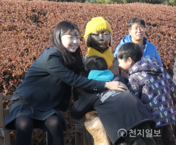 [천지일보 춘천=김성규 기자] 강원도 춘천시 공지천 조각공원에서 9일 ‘평화의 소녀상 제막’행사가 열린 가운데 제막식에 참석한 춘천의 학생들이 소녀상에 모자와 목도리를 씌우며 소녀상과 포옹을 하고 있다.