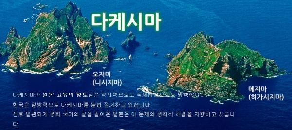 [천지일보=손성환 기자] 일본 정부가 일본 도쿄 시내에 독도 영토 주권을 주장하는 전시관을 개관하는 등 독도에 대한 허위 주장을 지속하고 있는 가운데 일본 정부 홈페이지에 한글로 버젓이 “다케시마(독도의 일본식 말)는 일본 고유 영토”라고 기록돼 있어 논란이 예상된다. 더구나 이 페이지는 우리 정부가 소개하고 있는 독도 페이지보다 접근성이 뛰어난 것으로 보인다.