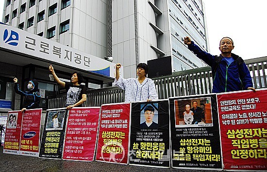 [천지일보=장요한 기자] 14일 삼성전자가 기흥 반도체사업장에서 미국 안전 연구기관인 인바이런에 의뢰한 반도체 생산라인의 근무환경 역학 재조사 결과를 발표한 이후 이날 오후 4시 ‘반도체 노동자의 건강과 인권지침이(반올림)’와 피해자, 유족들이 삼성전자와 근로복지공단(공단)을 규탄하는 집회를 가졌다.