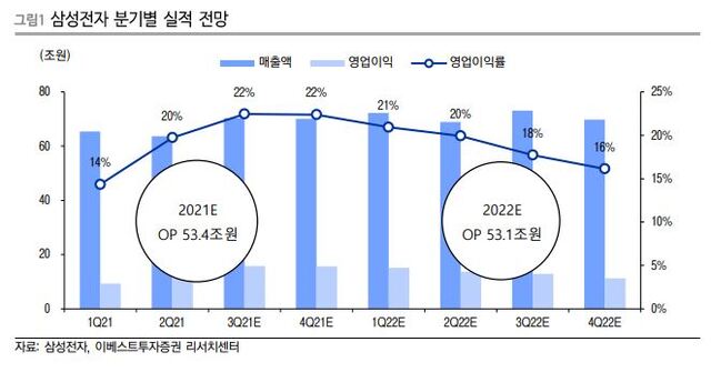 이베스트투자증권은 “3분기 실적은 매출액 70.3조원, 영업이익 15.8조원을 예상하는데 특히 반도체 부문의 이익 기여도가 급격히 상승할 것”이라고 전망했다. 세부적으로는 D램, 낸드 출하증가율이 상향되고 비메모리 가격 상승 효과가 반영될 전망이다. DP(디스플레이) 부문은 애플을 중심으로 글로벌 스마트폰 업체들의 신규 제품 출시로 가동률이 상승한다. IM(모바일) 부문은 폴더폰 등 신제품 출시로 매출은 증가하지만 마케팅비 역시 증가한다. CE 사업은 TV 출하량이 개선되나 제품 믹스 및 원가 절감이 이뤄지고 가전은 비수기에 진입한다.