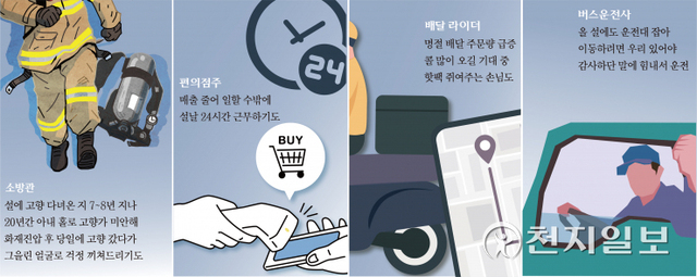 [천지일보=안채린‧양효선·정승자 기자] 떨어져 지내던 가족들과 만나 회포를 푸는 민족의 대명절 설이다. 오미크론 변이 바이러스 확산으로 확진자가 연일 기록치를 넘어서고 있지만, 그간 고향을 찾지 못했던 시민들은 조심스럽게 발걸음을 옮겨 이미 가족들과 만나 정을 나누고 있다. 감염병 우려 때문에 이동 계획은 없는 시민들은 연휴를 맞아 휴식하고 있지만, 시민들의 편의와 안전을 위해 쉬지 못하는 사람들이 있다. 가족 품이 그리워도 현장을 지켜야 하는 경찰관, 의료진, 소방관, 배달 라이더, 편의점 아르바이트생 등 명절 근무자는 곳곳에서 찾아볼 수 있다. 명절 연휴 기간에도 묵묵히 맡은 바 최선을 다하는 이들에게 사연을 들어봤다.