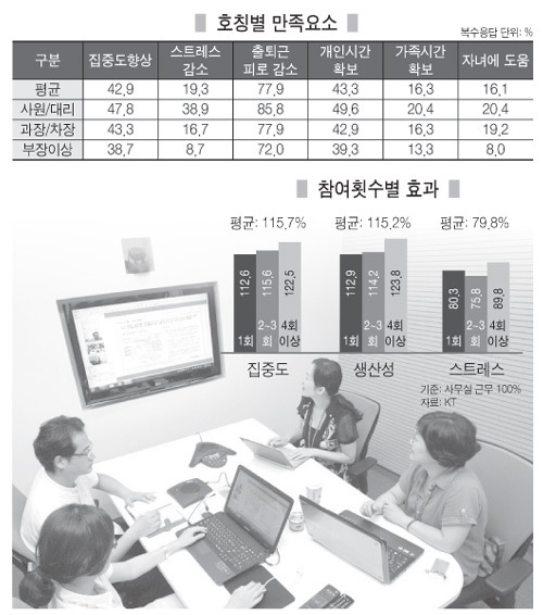 KT는 지난 4월부터 직원 2만여 명을 대상으로 본격적인 스마트워킹을 시행했으며 이에 따른 임직원들의 만족도도 높다는 게 KT의 설명이다.